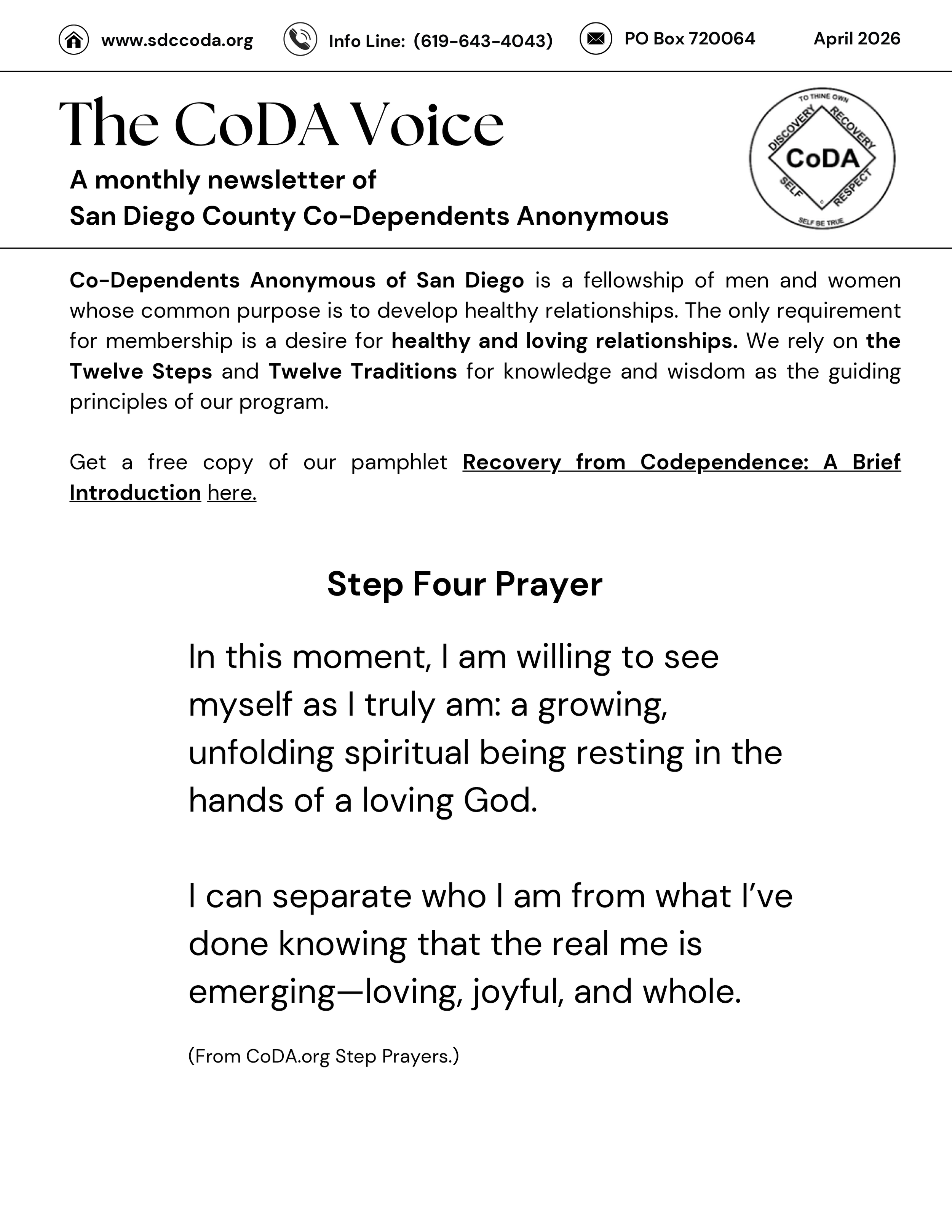 April 2026 CoDA Voice Newsletter Newsletter Mar 31 Written By David SDCCODA This month: Speaker’s Meeting, CoDAChella, Bowling and CoDATeen. Download April 2026 CoDA Voice here David SDCCODA